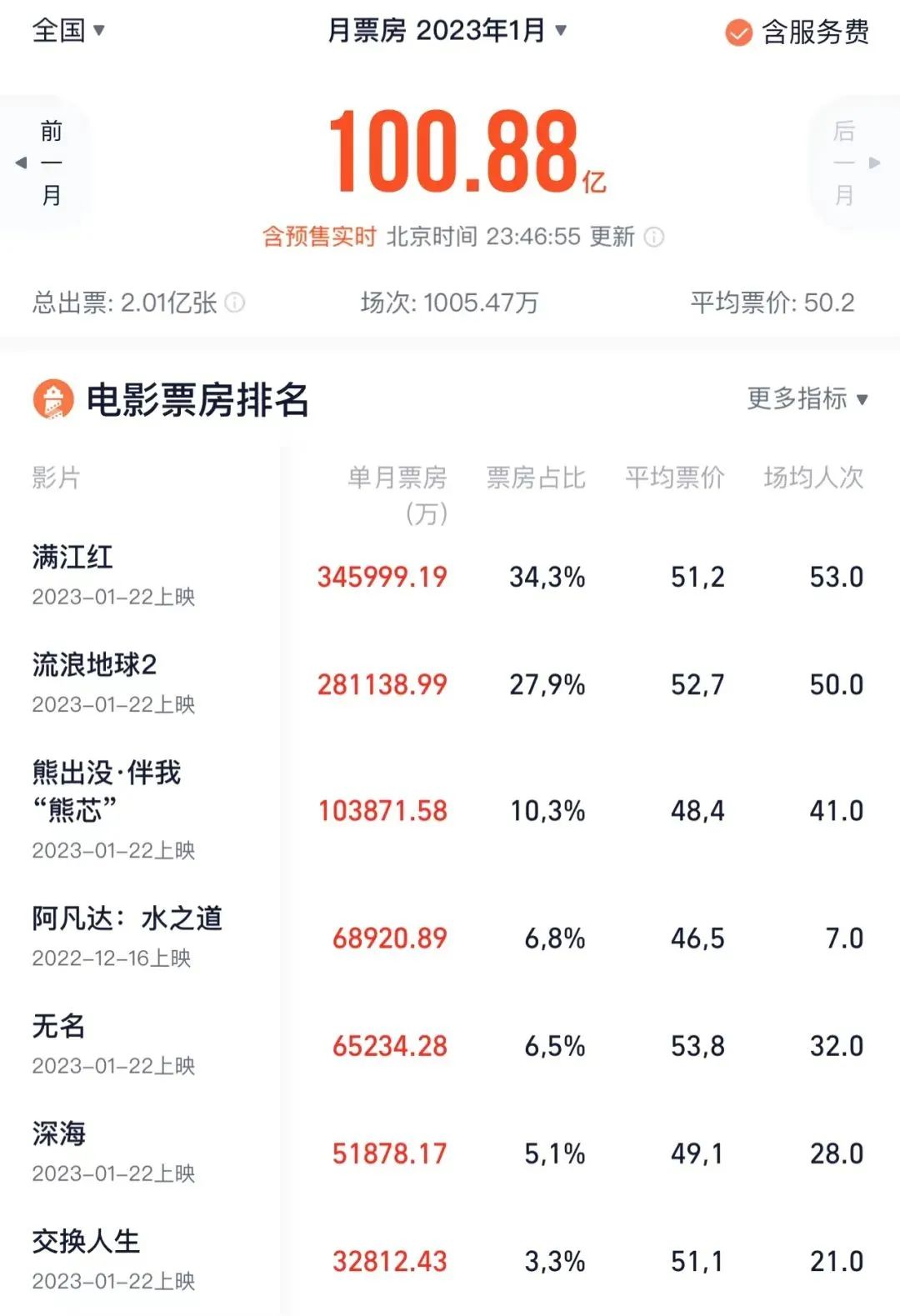 其中《满江红》和《流浪地球2》贡献了月度票房的60%,两部电影的豆瓣评分分别为7.3分、8.2分,这种口碑表现与票房分布基本一致,从初二开始每天的票房排名也非常稳定。这种消费模型的背后,是一个越来越成熟、理性的市场。
