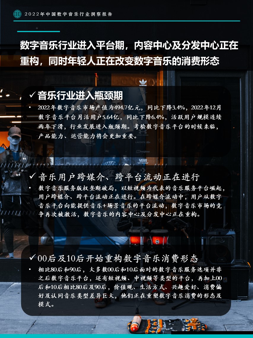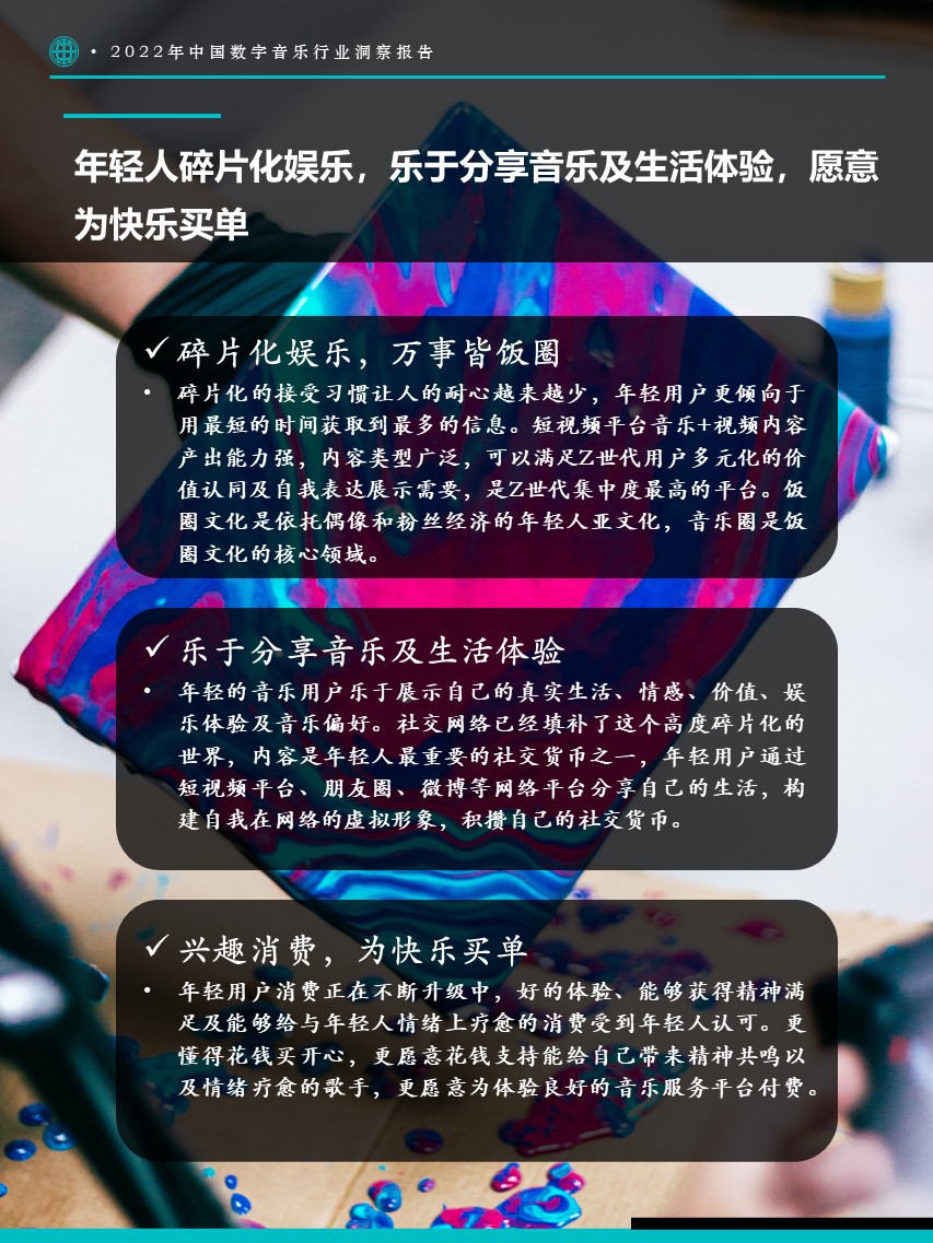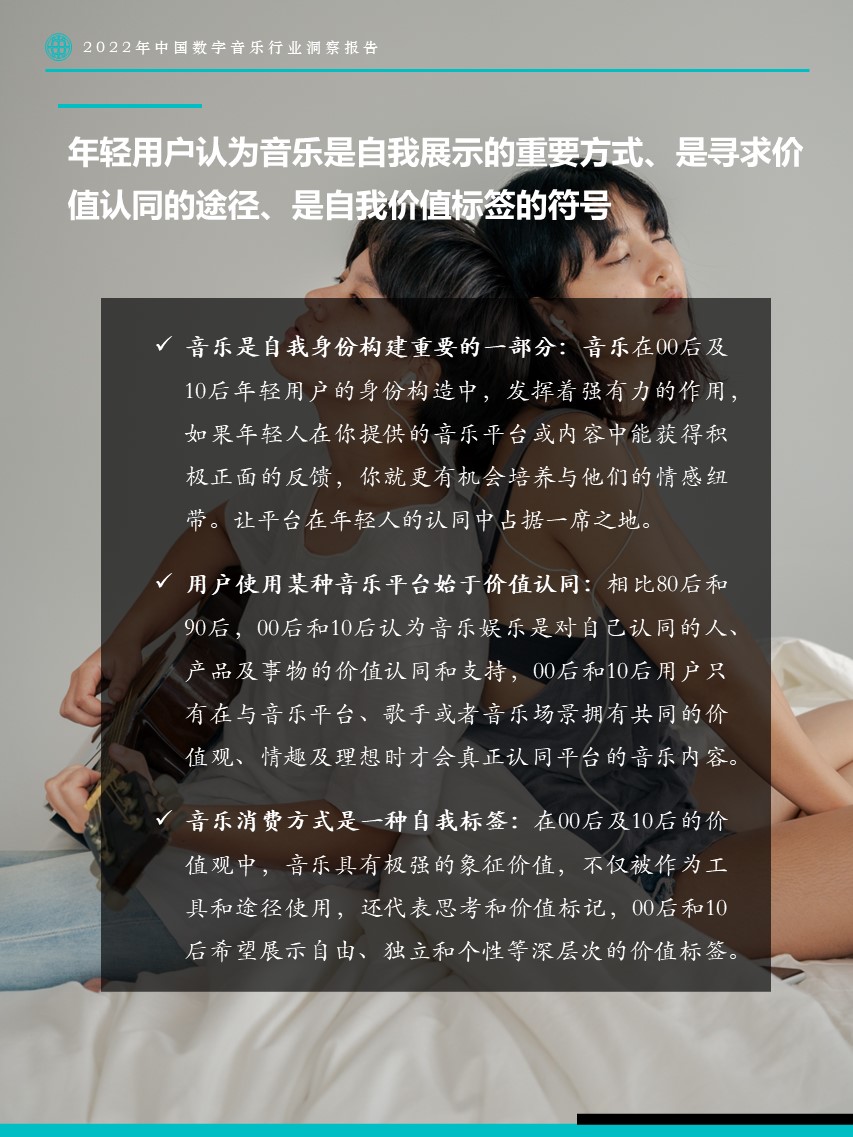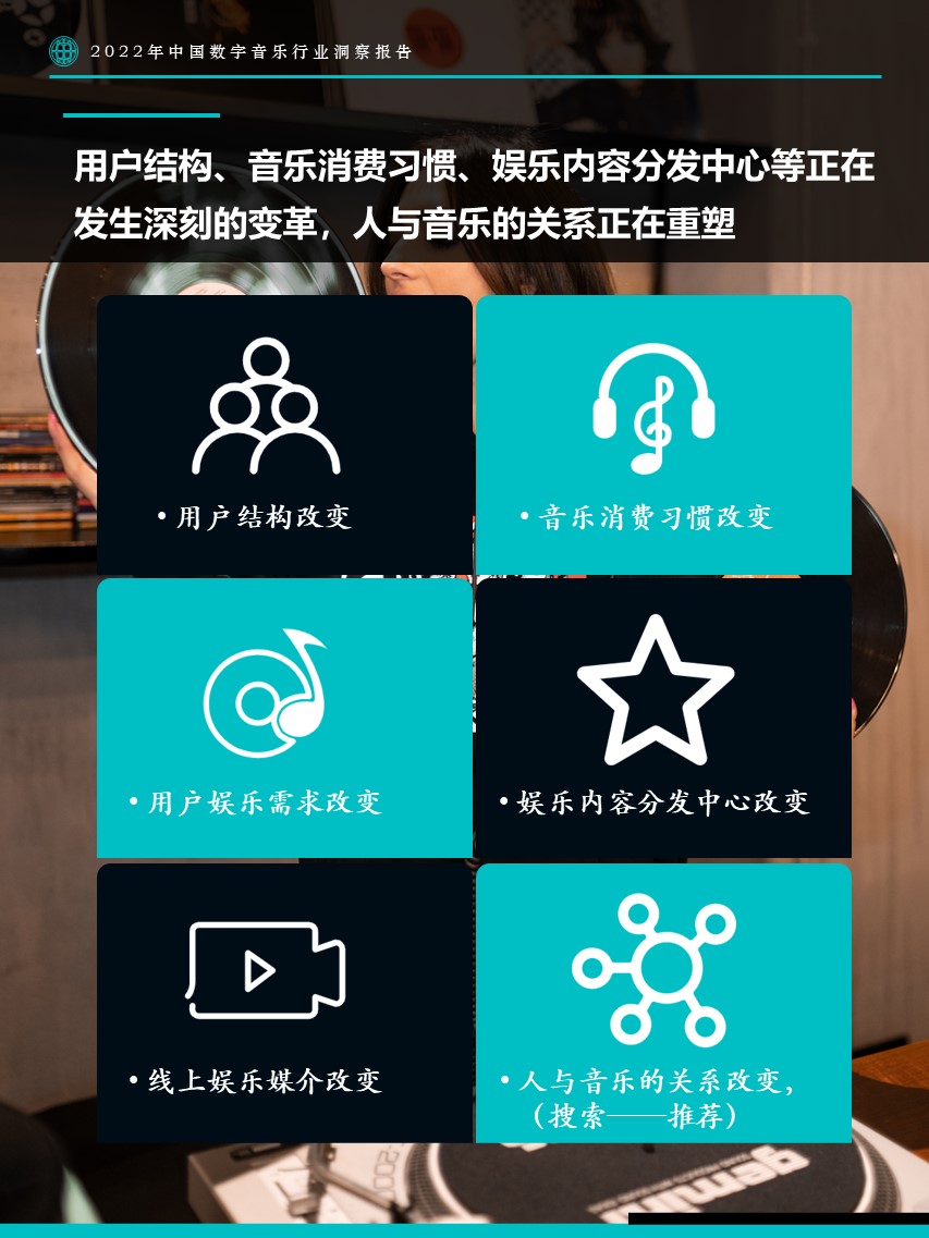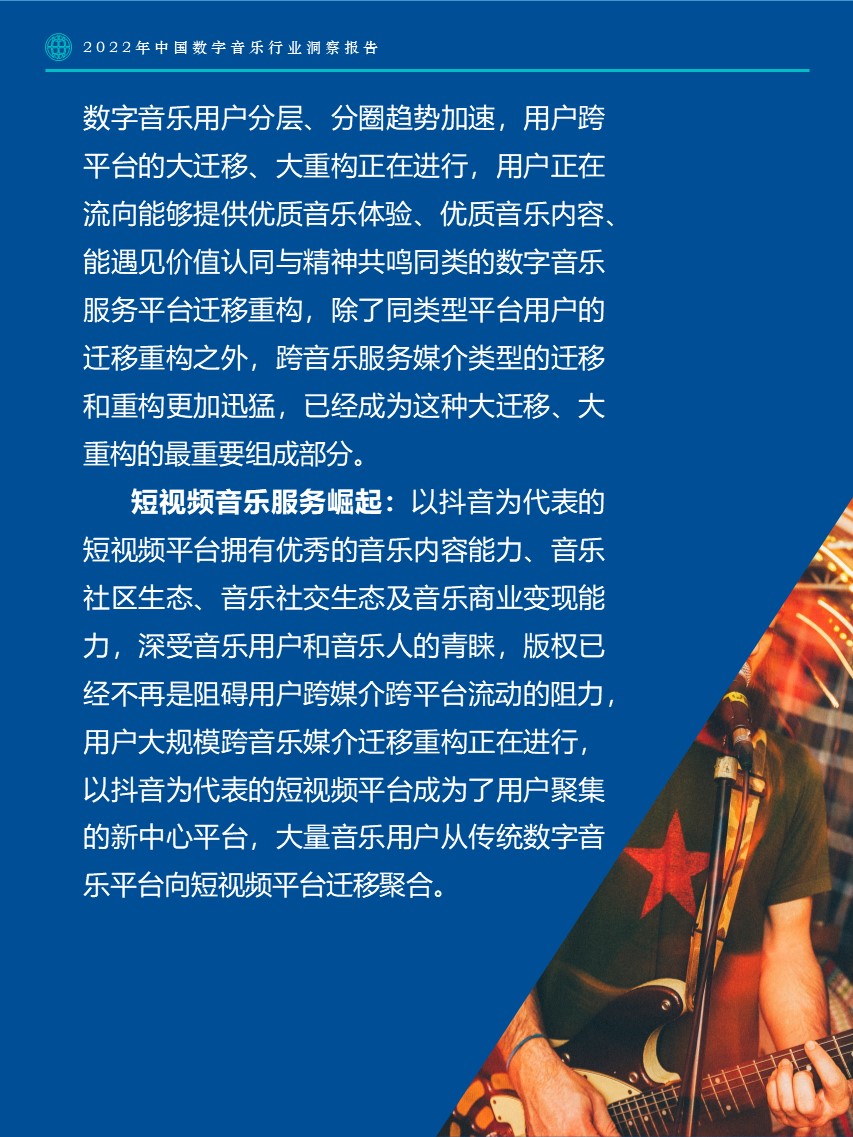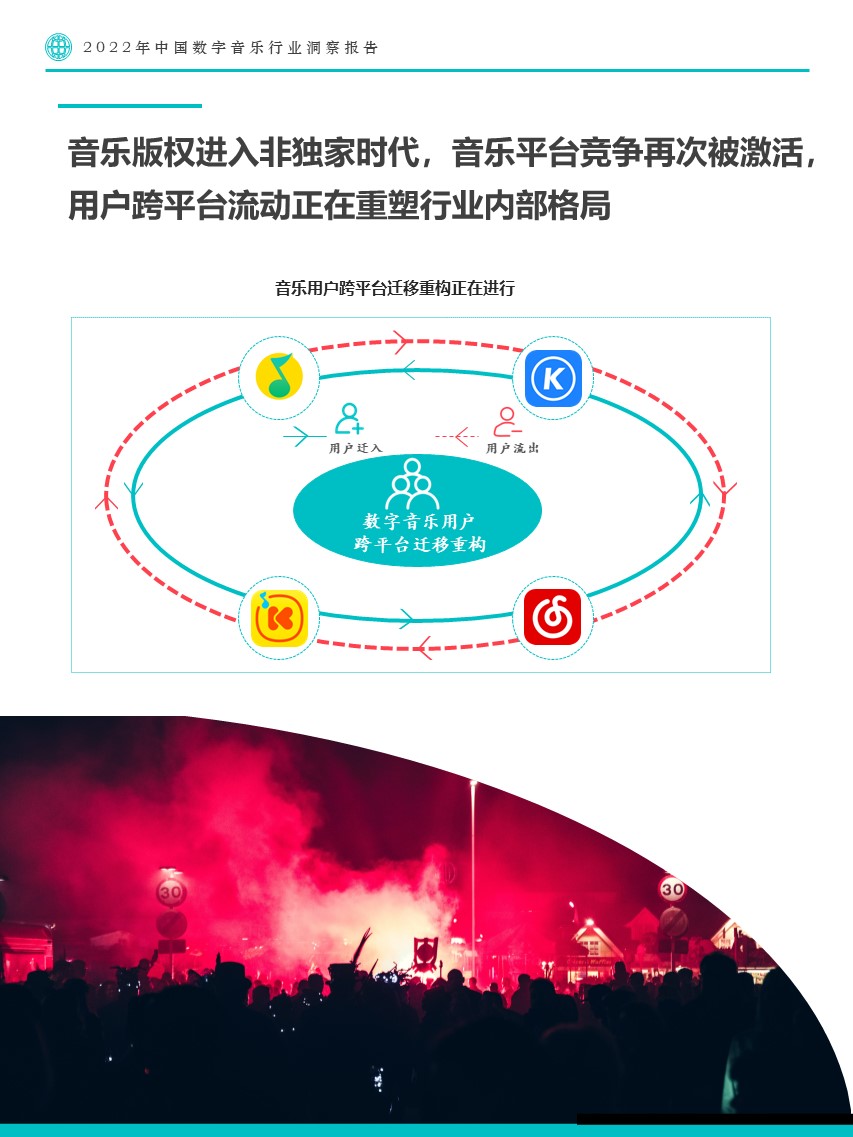 数字音乐用户大迁移、大重构:数字音乐竞争环境、用户年龄结构、用户偏好、用户需求及音乐版权市场正在发生深刻的变革。数字音乐用户分层、分圈趋势加速,用户跨平台的大迁移、大重构正在进行,用户正在流向能够提供优质音乐体验、优质音乐内容、能遇见价值认同与精神共鸣同类的数字音乐服务平台迁移重构,除了同类型平台用户的迁移重构之外,跨音乐服务媒介类型的迁移和重构更加迅猛,已经成为这种大迁移、大重构的最重要组成部分。