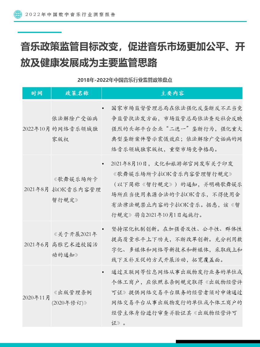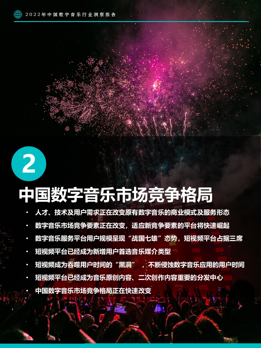音乐版权进入“非独家”时代:2021年国家市场监督管理总局责令腾讯解除独家音乐版权,终结了腾讯的音乐版权霸权,这对音乐行业来说意味着一个时代的结束,另一个全新时代的开启,通过垄断及控制上游版权获得竞争优势的时代已经结束,所有的数字音乐平台拥有了更加公平、透明及开放的市场竞争环境,而想要在全新的音乐市场竞争环境中获得竞争优势,就需要拥有更强的运营能力、更吸引用户的社区内容、更能链接人与音乐、人与人的优质社区生态。在版权“非独家”时代,数字音乐行业的竞争格局正在快速的改变,数字音乐市场的竞争重新被激活。