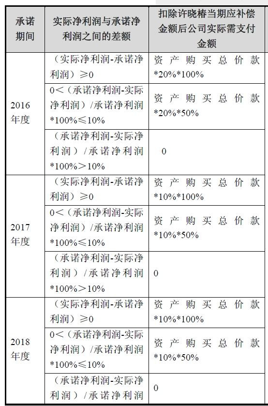 而剩余的40%,则在日后按照每年业绩完成情况进行支付,共分三年考核,2016年考核剩余价款的20%,2017、2018年各考核剩余价款的10%。只要每年未完成的业绩占总体业绩承诺的比例在10%以内,那么上市公司就会支付年度考核部分(扣除业绩补偿后)50%的价款给许晓椿等人;如果大于10%,上市公司则选择不继续支付;业绩承诺都达标,将支付考核部分100%的转让价款。