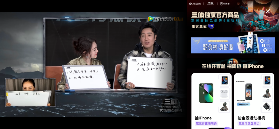 这一过程里,剧集、平台、品牌等等,都能丝滑地接入到点映礼的体系里,在沉浸式体验里进入用户心智,即时打通娱乐营销的路径。以《三体》点映礼为例,主创团队就以多种方式cue到独家总冠“纯甄”。此外,平台还巧妙地通过抽奖、开盲盒的方式,跟衍生品、电商等内容作了结合。