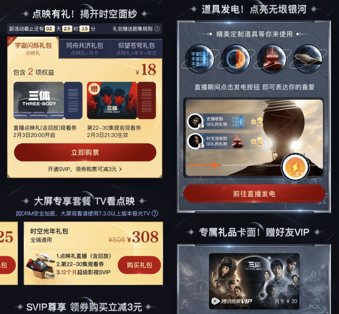 而如《三体》这般热闹的点映礼,往往是在展现优质内容自身吸引力的基础上,洞察用户情绪和习惯,依托直播技术打造的更具沉浸感、互动感,且能让参与用户和主创都刷出存在感的体验。甚至可以说,这是平台为剧粉精心打造的节日。