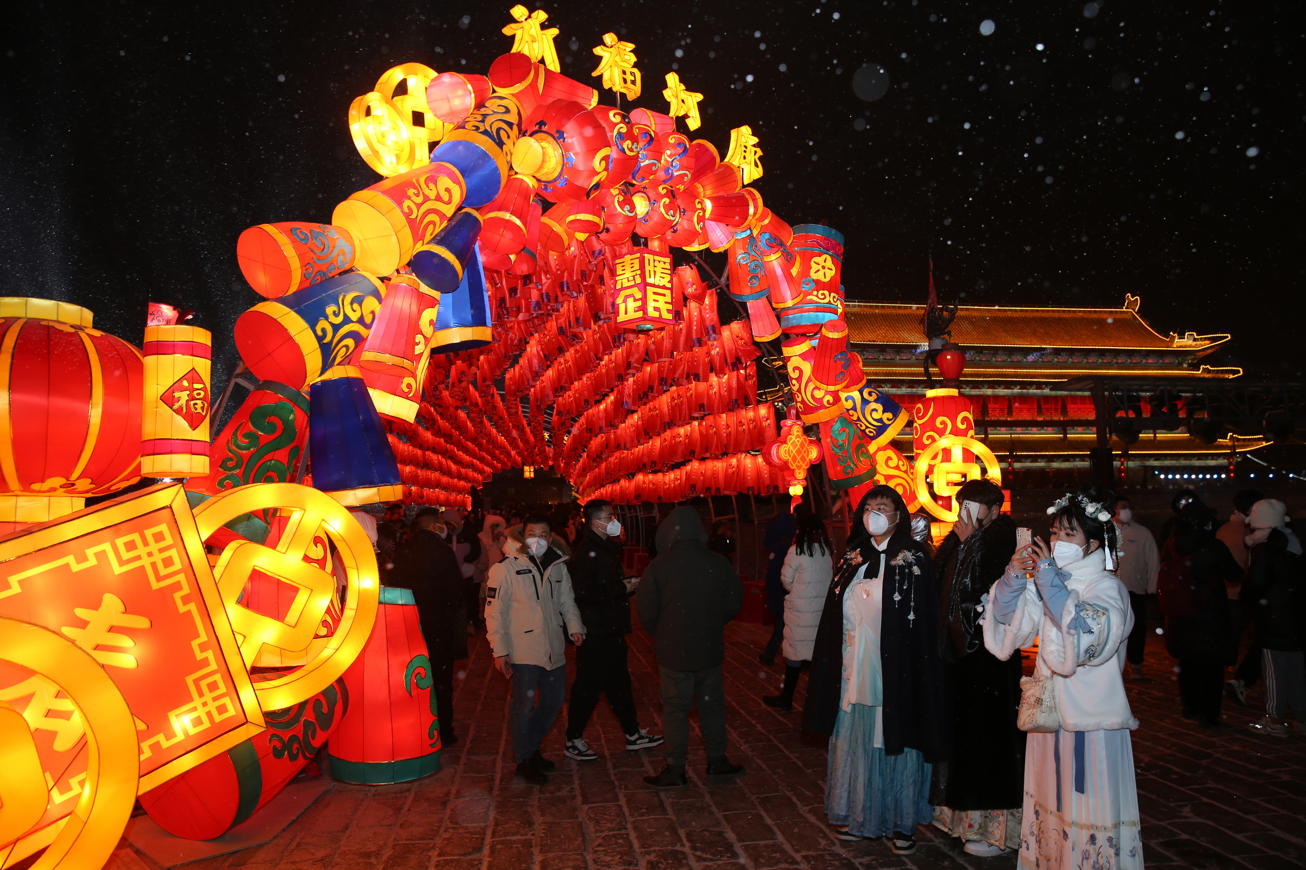 “逛灯会,赏花灯,年味儿满格!”对于常年在外地工作,逢年过节才回到家乡西安的高先生一家来说,正月里全家人一起逛灯会、赏花灯是过年的专属仪式感。从文昌门登上城墙,炫丽多彩又具有西安特色的各式花灯映入眼帘,经过了秦腔脸谱的梨园传奇灯组,穿过俏皮可爱的超活化仕女灯组,迎来盛唐流彩的牡丹、祥云灯组……高先生用手机全程记录着,一刻没停。“过年逛灯会是必不可少的传统,在西安城墙上看花灯,感受着一砖一瓦厚重的历史,远眺西安的夜景,一家人团团圆圆,一座城市元气满满,必须多拍点照片记录下来。”高先生说道。“手机上、电视上看再多遍都不如现场的氛围好!”高先生的爱人张女士说。