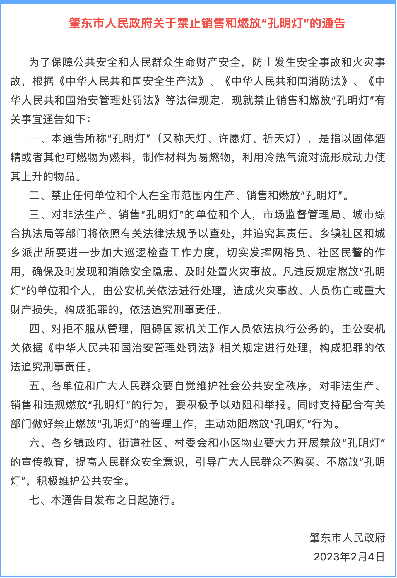 “网信肇东”微信公众号消息,肇东市人民政府发布通告,禁止任何单位和个人在全市范围内生产、销售和燃放“孔明灯”。通告指出,对非法生产、销售“孔明灯”的单位和个人,市场监督管理局、城市综合执法局等部门将依照有关法律法规予以查处,并追究其责任。乡镇社区和城乡派出所要进一步加大巡逻检查工作力度,切实发挥网格员、社区民警的作用,确保及时发现和消除安全隐患、及时处置火灾事故。凡违反规定燃放“孔明灯”的单位和个人,由公安机关依法进行处理,造成火灾事故、人员伤亡或重大财产损失,构成犯罪的,依法追究刑事责任。对拒不服从管理,阻碍国家机关工作人员依法执行公务的,由公安机关依据《中华人民共和国治安管理处罚法》相关规定进行处理,构成犯罪的依法追究刑事责任。