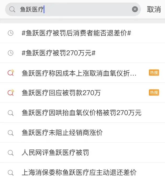 产品质量问题频发风波尚未平息,该公司此次又因疫情期间哄抬物价被罚,造成了消费者情绪反弹。处罚信息公布后,“鱼跃医疗被罚270万元”“鱼跃医疗被罚后消费者能否退差价”话题登上微博热搜,消费者权益保护成为热议话题。