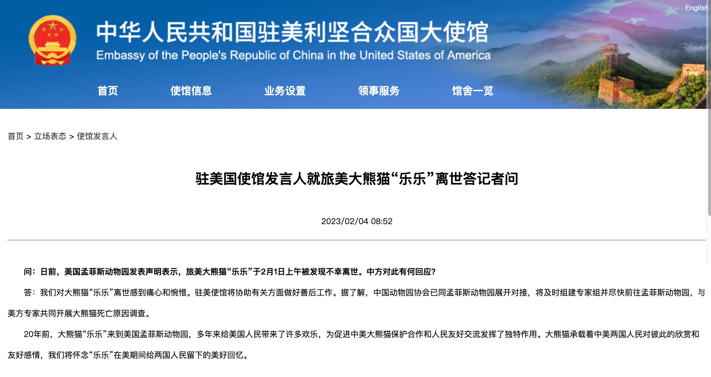 据中华人民共和国驻美利坚合众国大使馆网站2月4日消息,驻美国使馆发言人就旅美大熊猫“乐乐”离世答记者问。