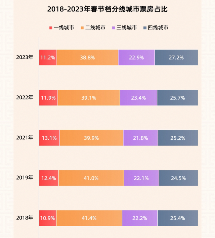 在过往的票房数据统计中,春节档的三四线城市票房产出,通常比其他档期要高出15-20%。灯塔研究院发布的《2023年春节档电影市场数据洞察报告》数据显示,今年春节档期间,三四线城市消费占比首次超50%。各家片方在这个档期中都要首先回答一个问题,如何去做下沉市场。