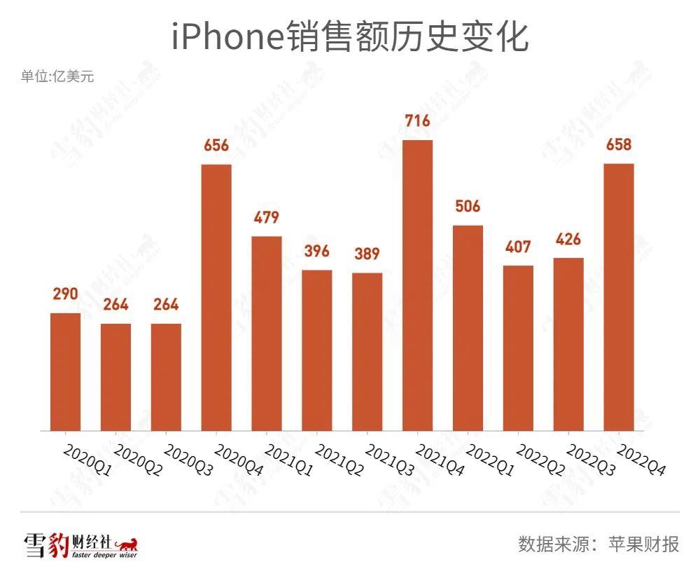 2022年Q4,iPhone的销售额同比下降8.17%至657.75亿美元,低于此前华尔街给出的682.9亿美元的预期。