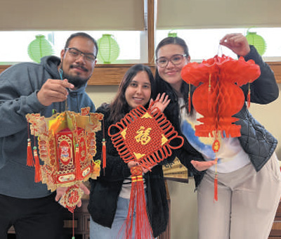 墨西哥奇瓦瓦自治大学孔子学院学生手持中国结和福字等装饰合影留念。