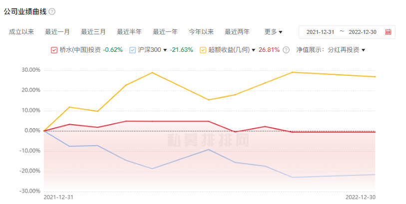 私募排排网数据显示,截至2022年12月30日,桥水(中国)投资管理有限公司去年超额收益(几何)为26.81%,全年收益为-0.62%。