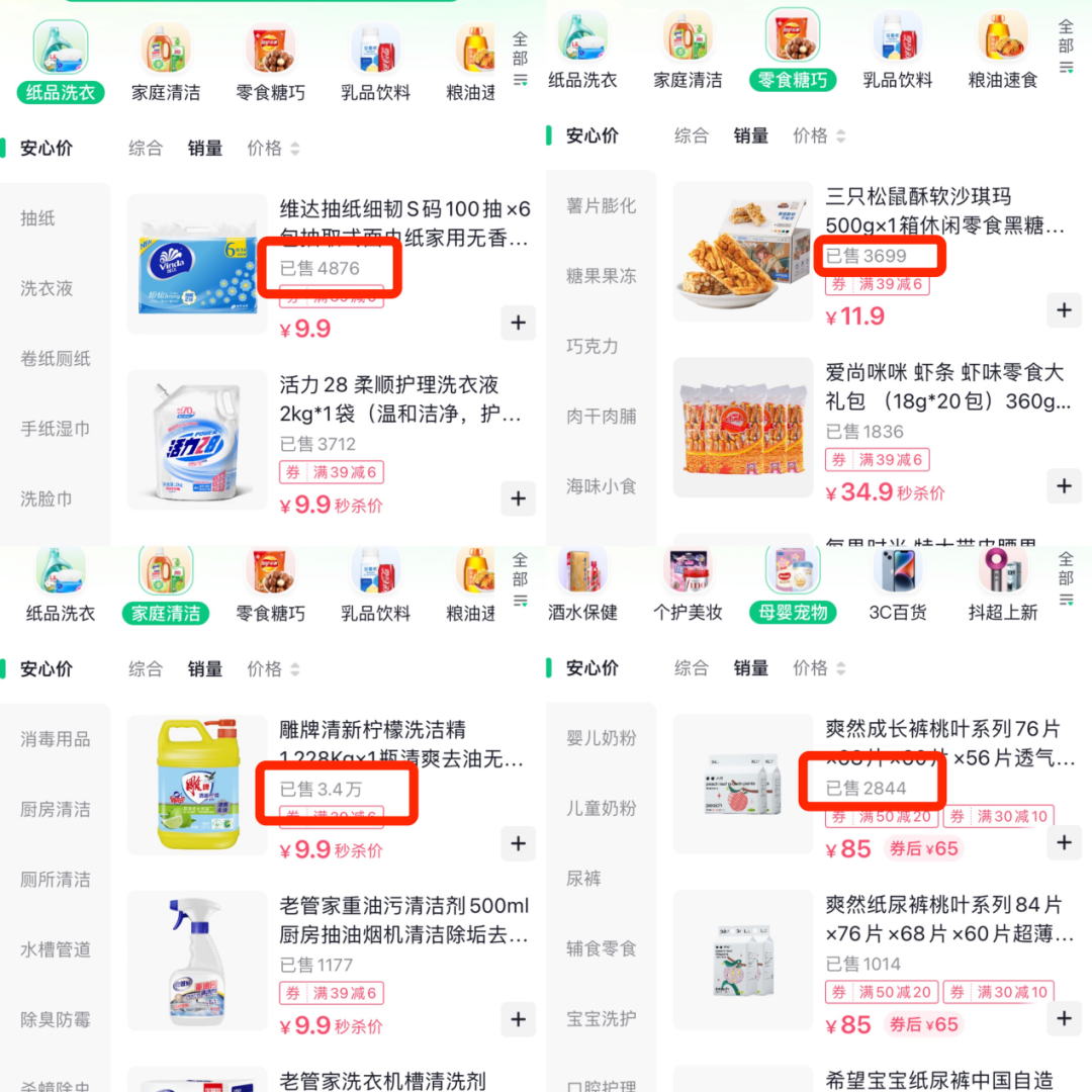 目前,家庭清洁、零食糖巧、母婴宠物等板块销量最为可观。维达、三只松鼠、雕牌等国产老品牌销量均上千。