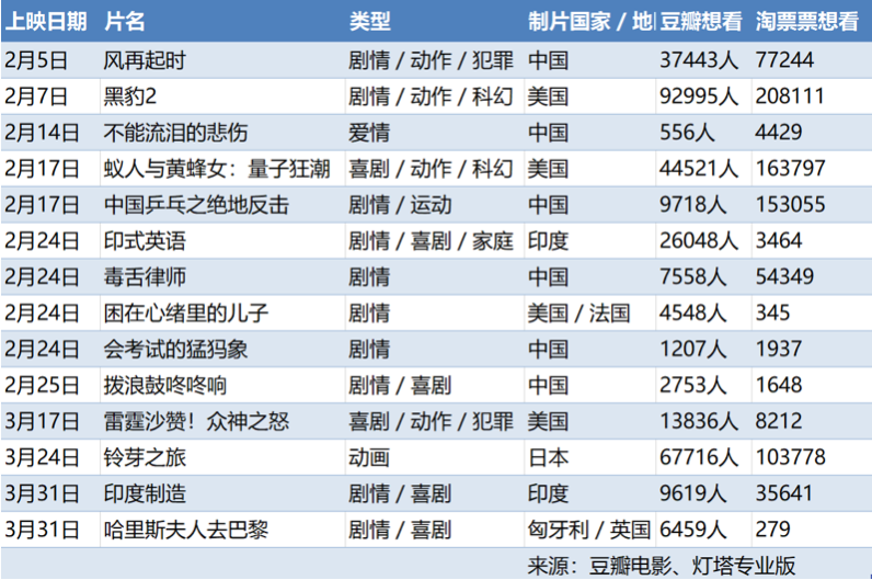 据豆瓣电影等平台统计,2、3月份已定档主要电影情况如下(截至2月2日午间):