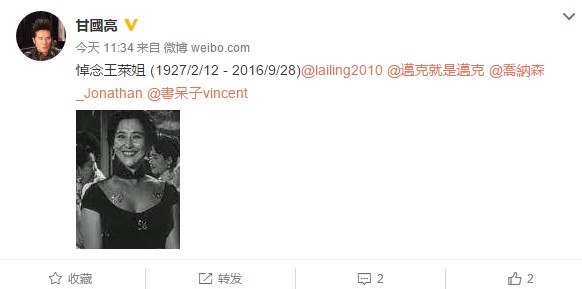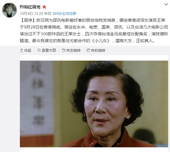 10月4日,微博博主@烈焰红唇龙 发微博称香港资深女演员王莱9月28日在香港去世。今日上午,香港编剧甘国亮发微博证实此事:“悼念王莱姐 (1927/2/12 - 2016/9/28)”,“前辈王莱姐(2016/9/28)十月七号红磡世界殡仪馆出殡”。