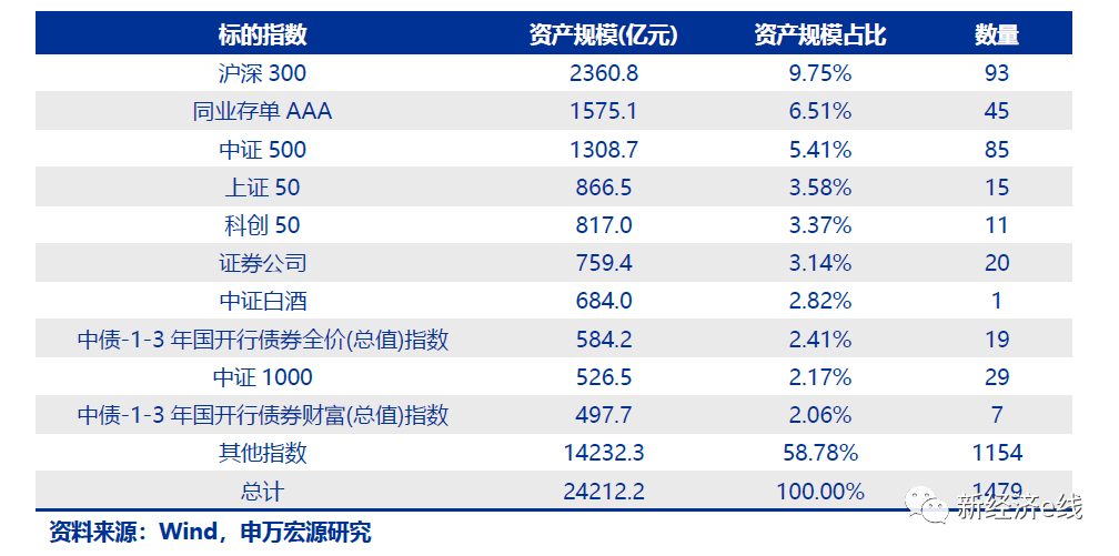 Wind统计表明,截至2022年12月31日,指数基金数量前三的标的指数依次为沪深300指数、中证500指数、同业存单AAA指数,跟踪指数基金数量分别多达93只、85只和45只;指数基金规模前三的标的指数依次为沪深300指数、同业存单AAA指数、中证500指数,规模分别为2360.8亿元、1575.1 亿元、1308.7亿元,占比分别为9.75%、6.51%、5.41%。包括以上三大标的指数在内,指数基金规模最大的前十大标的指数合计占据41.22%的指数基金规模。