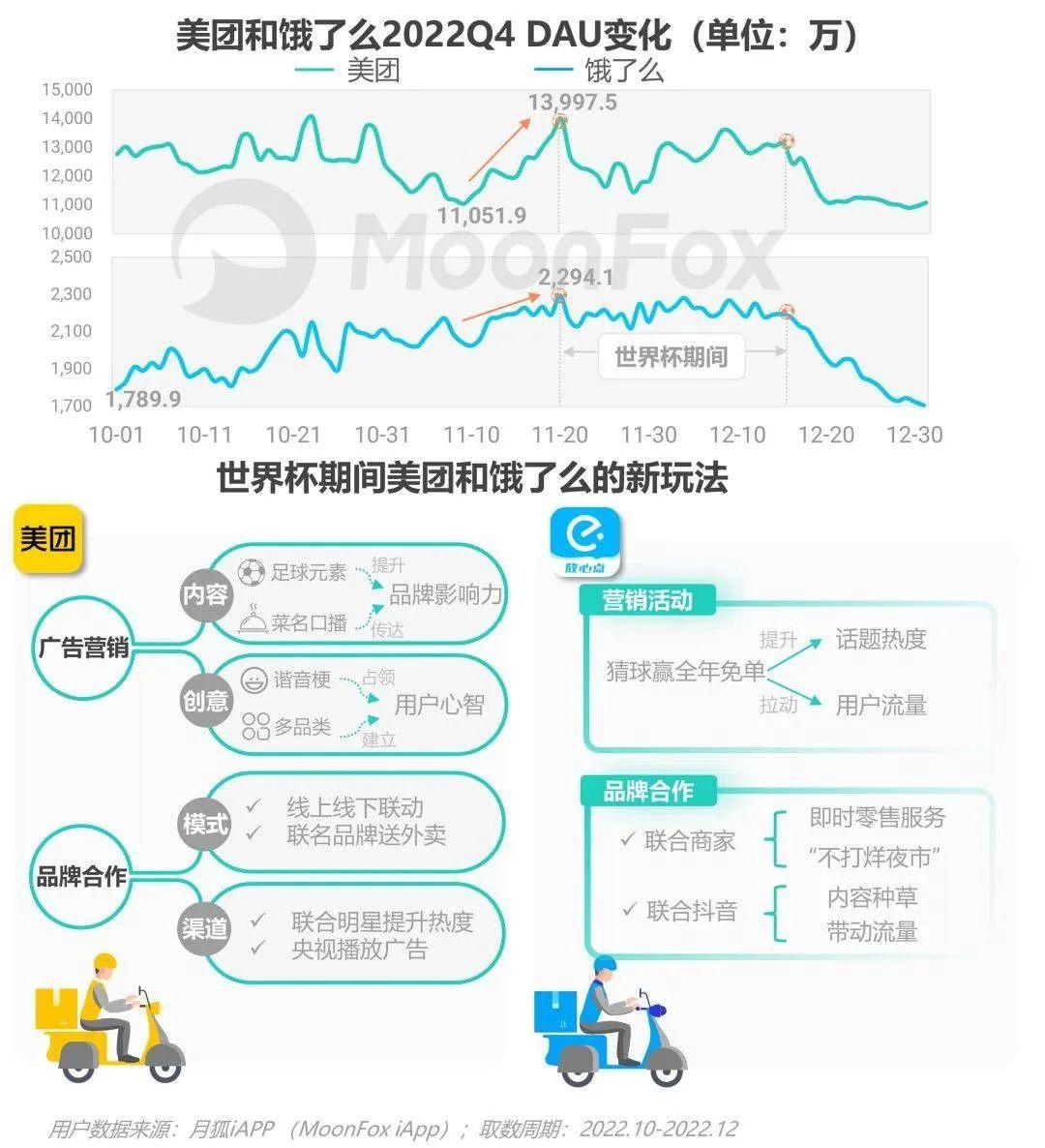 一步慢,步步慢。去年世界杯期间,美团和饿了么都抓住这个机会进行营销,在开幕式当天都双双迎来了日活新高峰,数据显示,11月20日美团的日活近1.4亿,饿了么却仅有2294.1,连美团的零头都未达到。