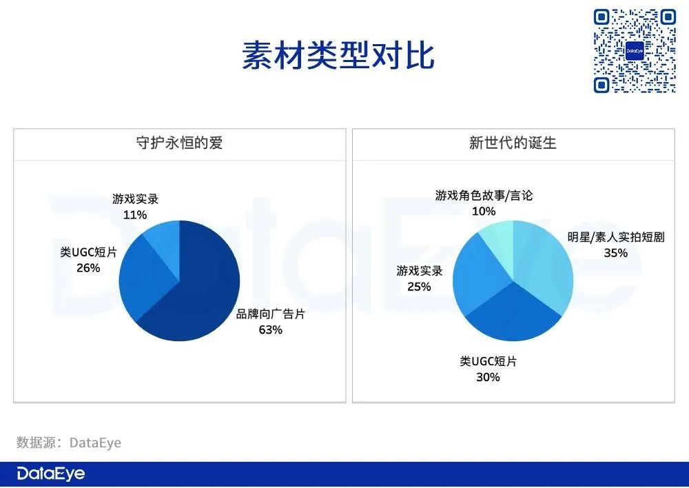 《永恒守护的爱》素材展示强烈的品牌意向,也可能因为上线时间较早,更偏向打开受众对IP的兴趣和认知。