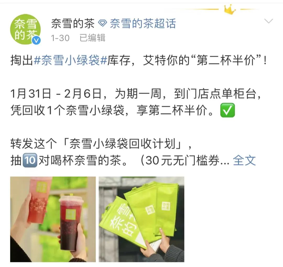奈雪则发起奈雪小绿袋回收活动,1个小绿袋可享受“第二件半价”,也收获了一大波好感;