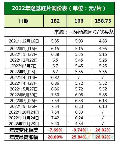 据国际能源网/光伏头条(PV-2005)统计2022年硅片龙头隆基股份14次调整硅片价格。