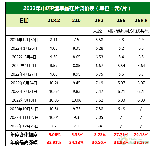 另一位硅片巨头中环股份2022年调价10次,最高价出现于2022年9月8日。218.2mm硅片年度最高涨幅为33.91%,210最高涨幅为34.13%,182硅片最高涨幅为36.56%。