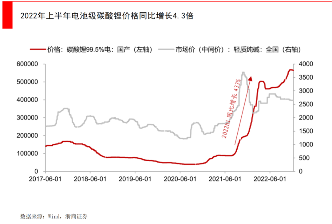 作为锂资源消耗大国,而自有资源储量又少,在电动车需求暴增的大背景下,锂价急剧攀升。截至2022年12月已突破55万元/吨,相较于2020年7月涨幅近1300%。锂电池材料成本也随之翻倍上涨,产业链利润向上游原材料集中,中下游苦不堪言。