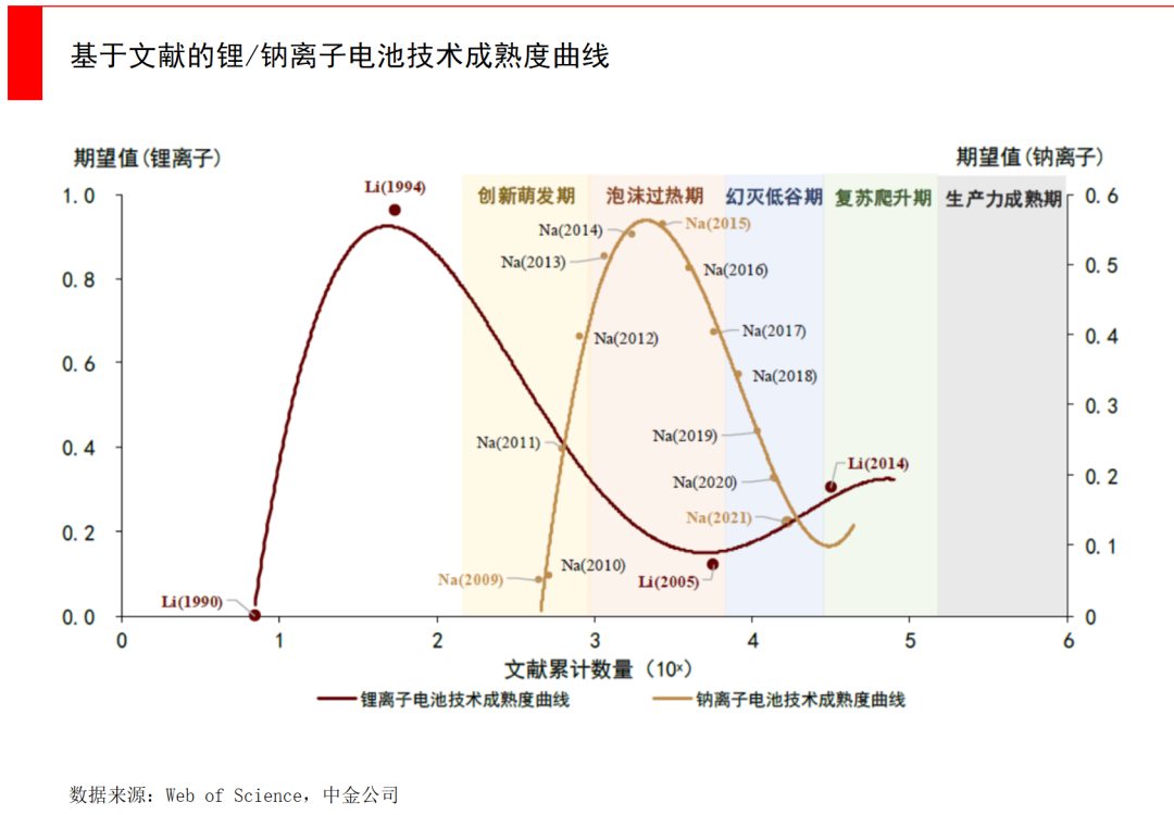 - 创新萌发期(2010-2012):即新技术的第一个上升阶段,主要由技术突破或新增需求引发市场关注度的加速提升;对于钠离子电池来说,此阶段的驱动力主要来自于对锂离子电池的替代需求。