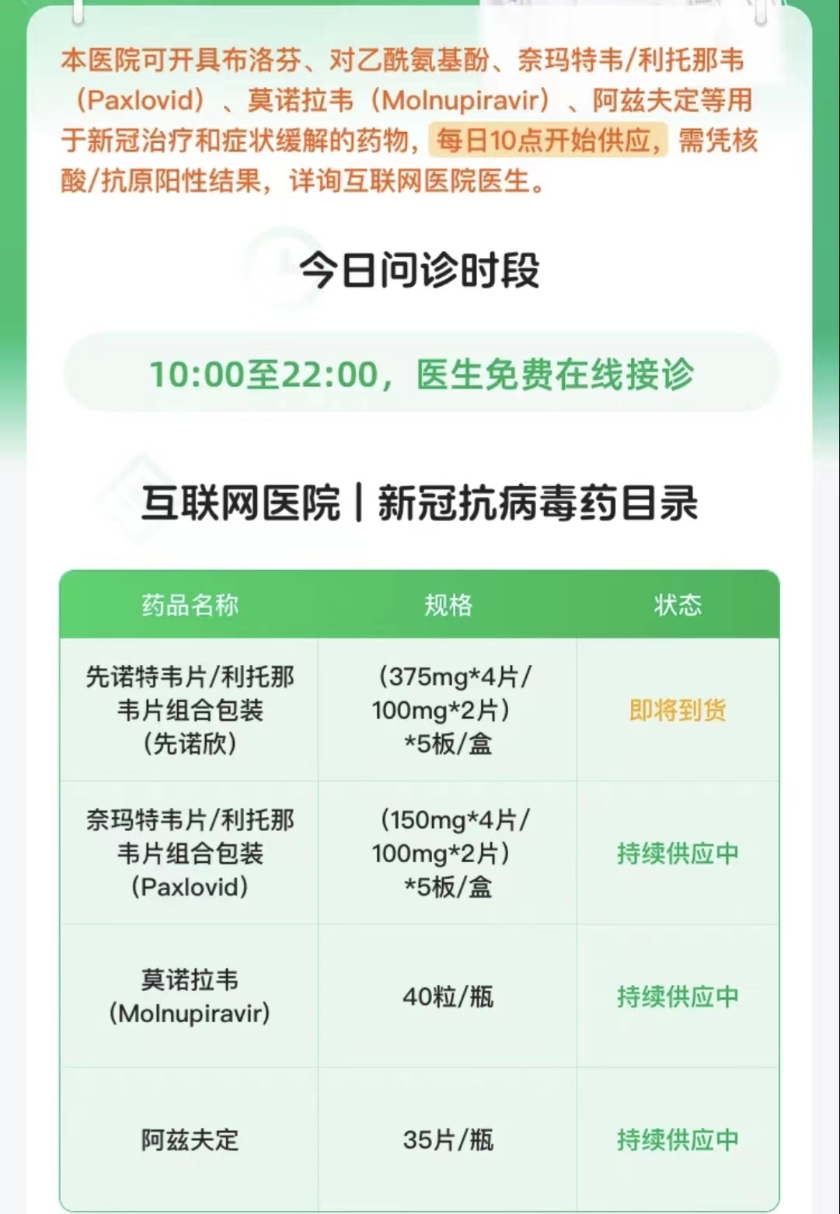 此外,Paxlovid、阿兹夫定、莫诺拉韦也可以在京东、美团、淘宝等线上平台凭处方开出。2月6日,记者查询发现,淘宝、支付宝端由阿里健康互联网医院提供服务,问诊时间延长至早10点至晚10点。京东则为全天候诊,开方购药,不再需要如此前晚8点蹲点抢购。阿里健康互联网医院平台还显示,先诺欣也即将到货。不少网友在社交平台上分享自己买到药的经历。