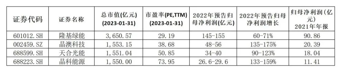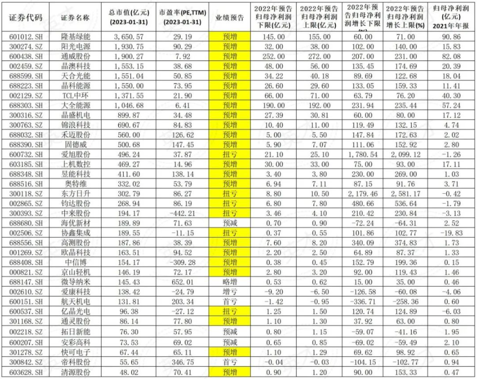 早在春节前A股已有多达30家光伏企业迫不及待的发布了业绩预告,覆盖光伏全产业链。春节后,截止1月31日,据统计,已有35家光伏板块上市公司发布了2022年的业绩预告,28家预告业绩预增或者扭亏,占比达到八成。其中,硅料龙头大全能源(688303.SH)预计全年净利润可以达到190亿,光伏组件龙头的隆基绿能(601012.SH)预计2022年净利润有望冲击150亿大关,而210大尺寸硅片龙头TCL中环(002129.SZ)、光伏电池头部的晶澳科技(002459.SZ)净利润规模也有望突破50亿。