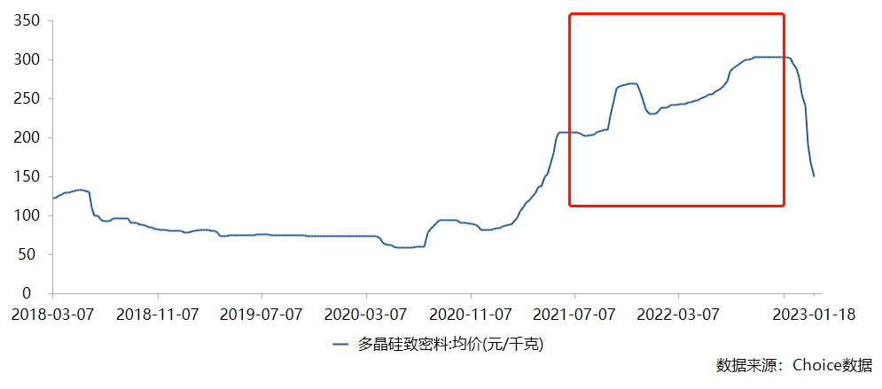 收益于多晶硅料价格全年高位,光伏产业链最上游的硅料企业无可厚非的成为去年光伏板块的最大“赢家”,堪比2021年的碳酸锂。虽然2022年年底硅料价格出现大幅下滑,但从全年均价来看,2022年多晶硅致密料的价格基本稳定在250元/千克(25万/吨)左右,下半年更是一度超过300元/千克(30万元/吨),全年价格高位也让硅料的头部企业赚的盆满钵满。