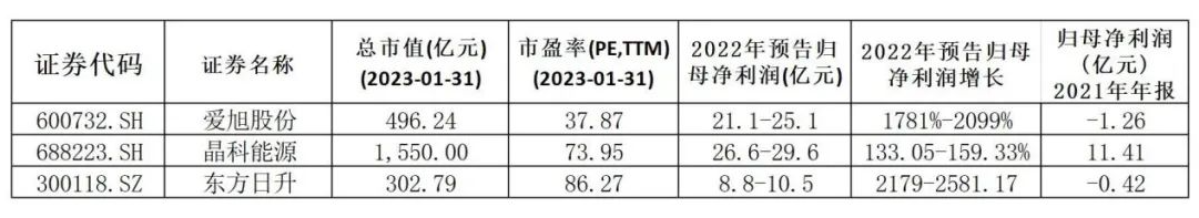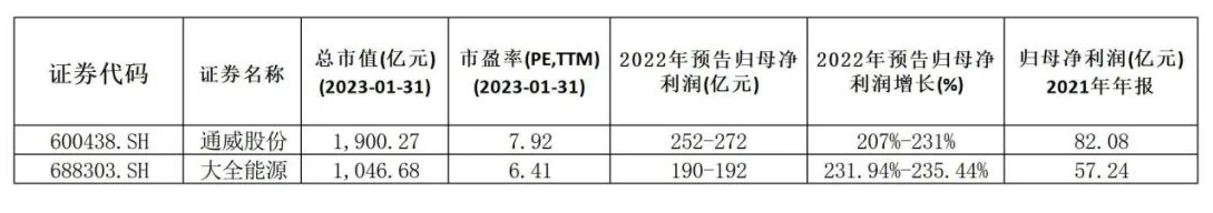 另外,特变电工旗下控股子公司新特能源作为非上市公司,2022年预期的归母净利润也不少于130亿元,还有港股的协鑫科技(03800.HK),作为国内硅料的“四天王”之一,虽然暂时披露业绩预告,但业绩高增的预期不会差。