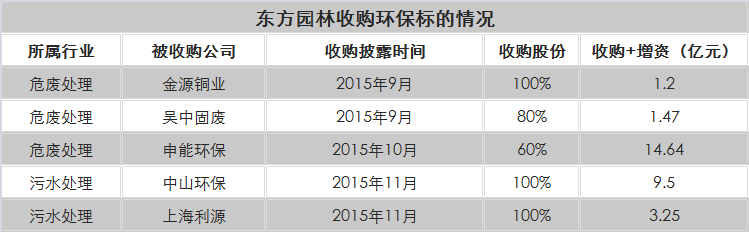 东方园林的并购路径是,2015年9月以现金1.47亿元收购了吴中固废80%的股权并增资,以1.2亿元收购富阳金源铜业100%股权并增资。10月,公司以现金14.6亿元收购申能固废60%的股权。11月公司又披露通过现金加股份方式以9.5亿元收购了中山环保100%股权,并以3.3亿元收购了上海立源100%股权。