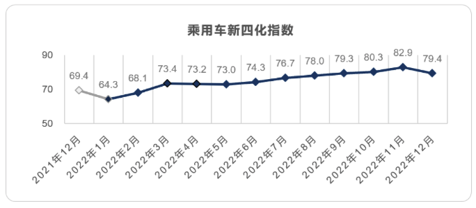2月6日,乘联会发布的数据显示,2022年12月乘用车新四化指数为79.4。其中电动化指数为29.5;智能化指数为47.4;网联化指数为56.9。2022年度,全国乘用车新四化指数从年初64.3上升至年末79.4,整体呈现稳步上扬的格局。