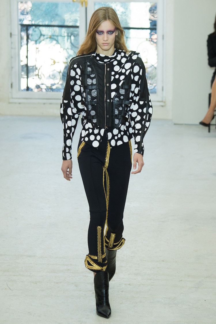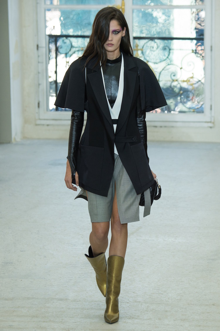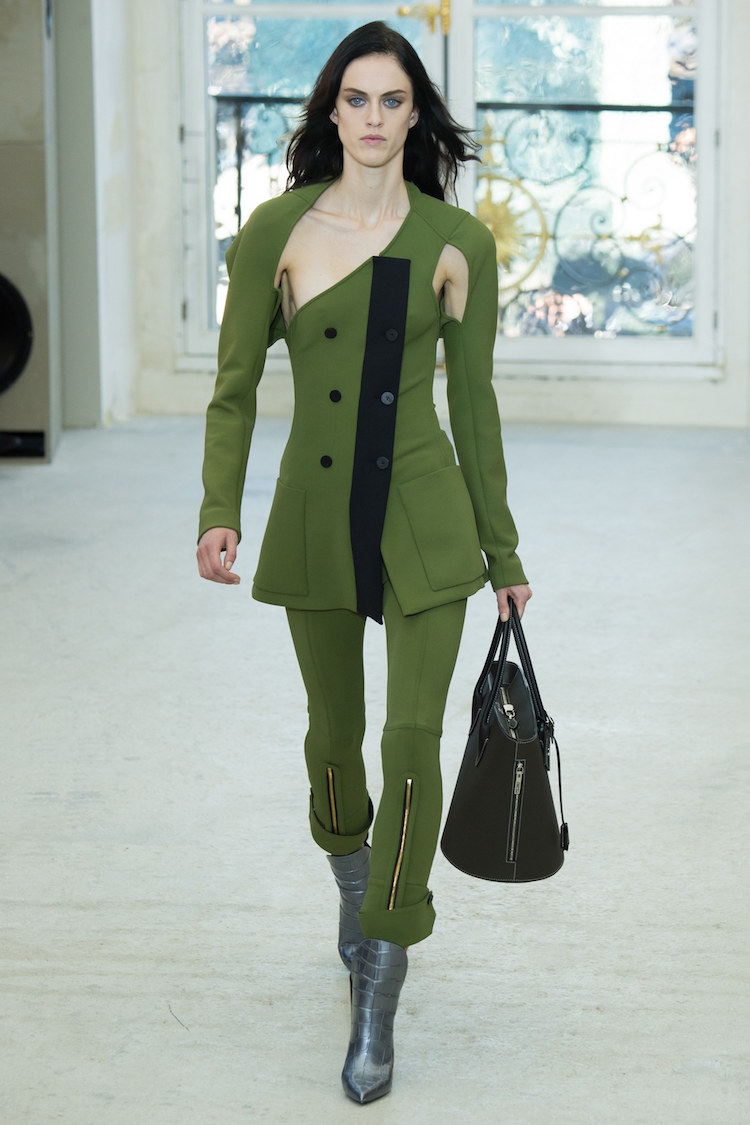 1984年,一部名为《右岸,左岸》的法国电影成为了Louis Vuitton2017春夏女装系列的来源。在这部以企业集团和律师事务所为背景的故事里,女主角的着装无疑成为Nicolas的心头好,这也是他从处女作至今每次都在强调的“衣橱概念”的一部分。“故事里的女主角非常坚强,非常精致,我很好奇如何将这些通过衣装变为现实。“Nicolas在后台接受采访时表明。显然,那些用于制作男士西装的面料是最好的证明。放在80年代,穿这种西装的女性被称之为“power women“,如今Nicolas用新的剪裁和搭配方式呈现了带了带有未来风格的套装。至于那件芥末绿的外套,剪裁复杂,样式大胆,这的确是Nicolas的私人喜好。