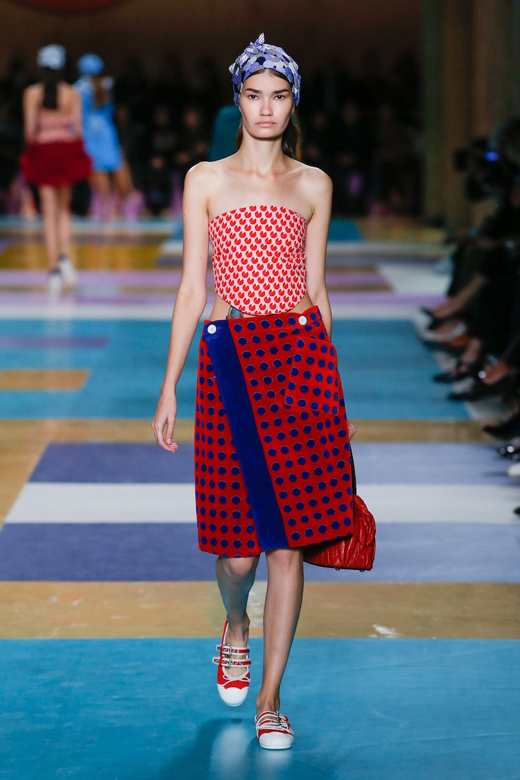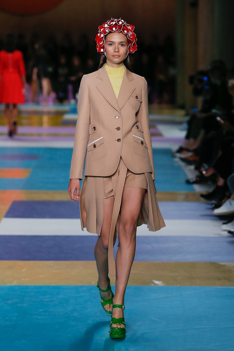 Miu Miu这个带有1950年代沙滩氛围的系列被称之为“合成夏日”。在巴黎耶纳宫,Miuccia Prada继续与AMO事务所合作,将Miu Miu秀场打造成一座人造的夏日景观。