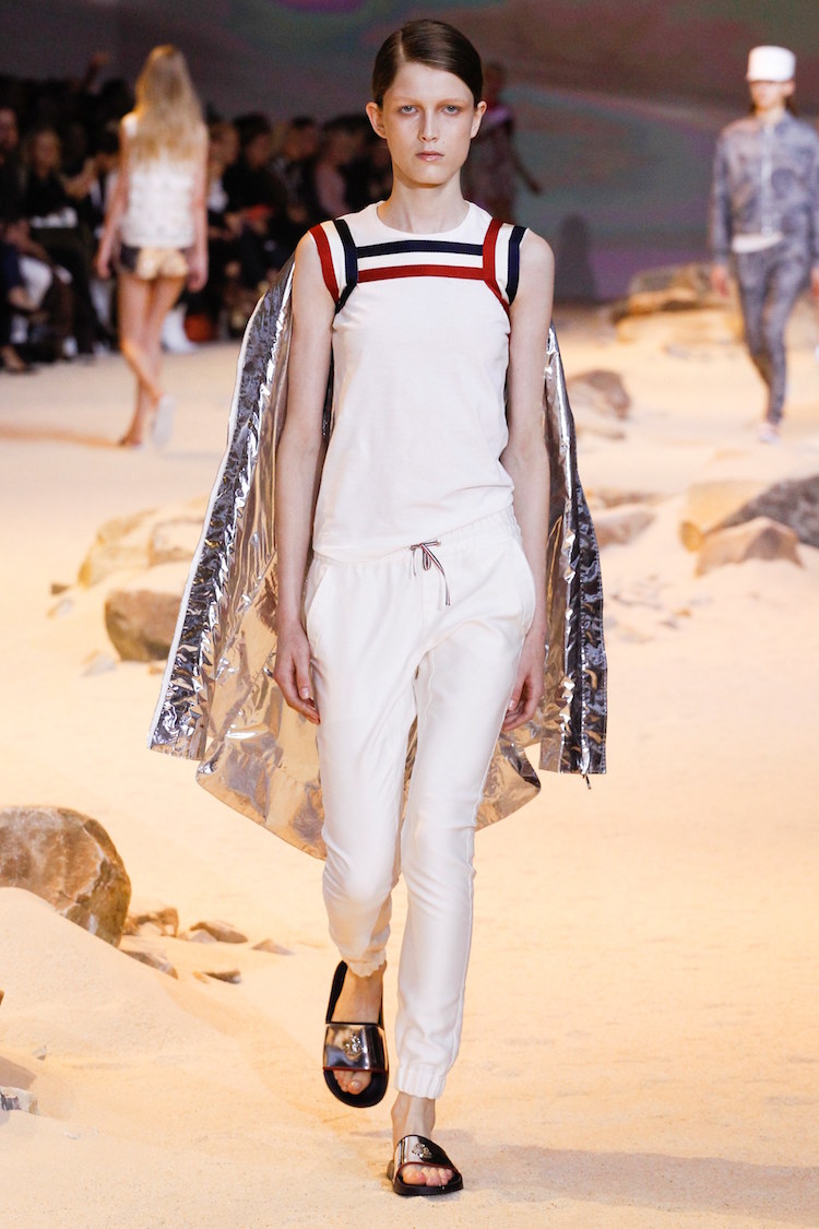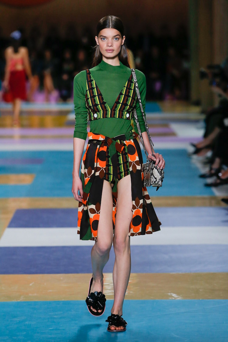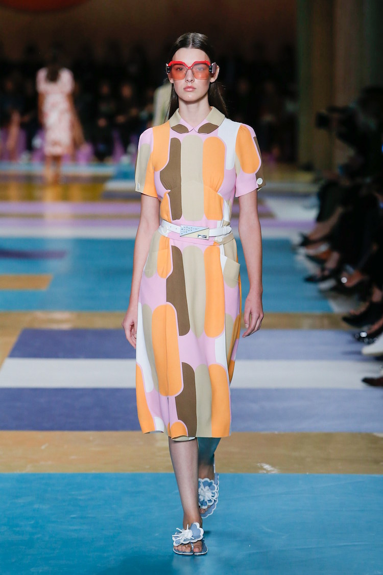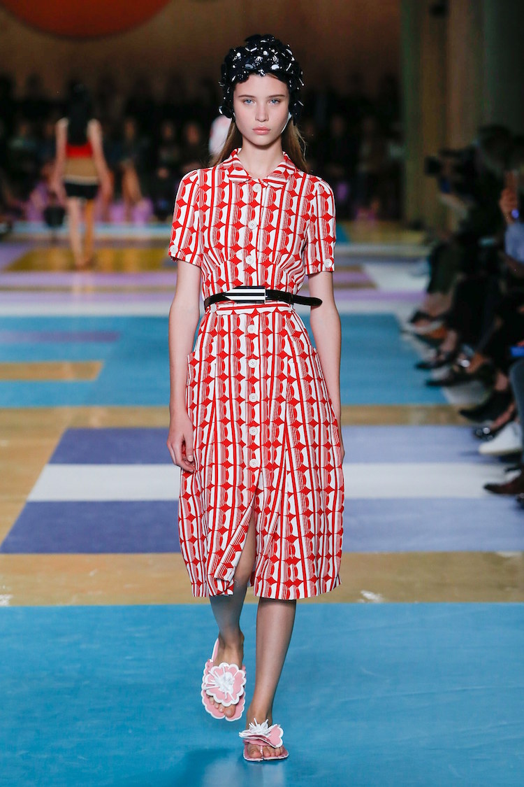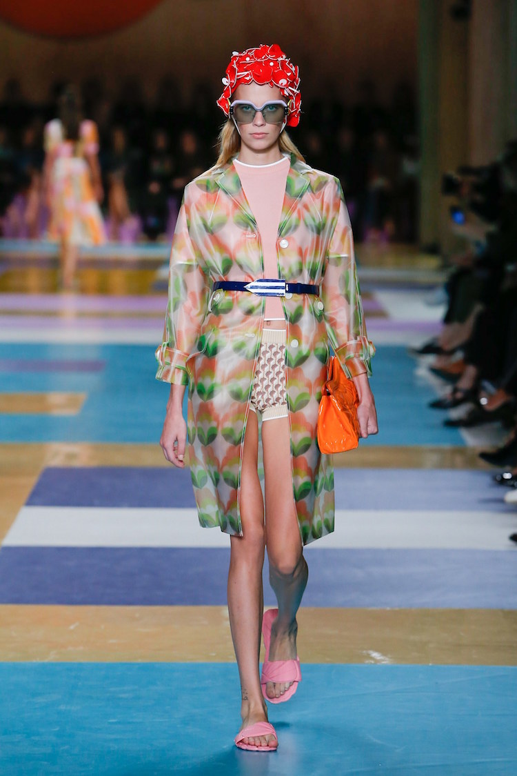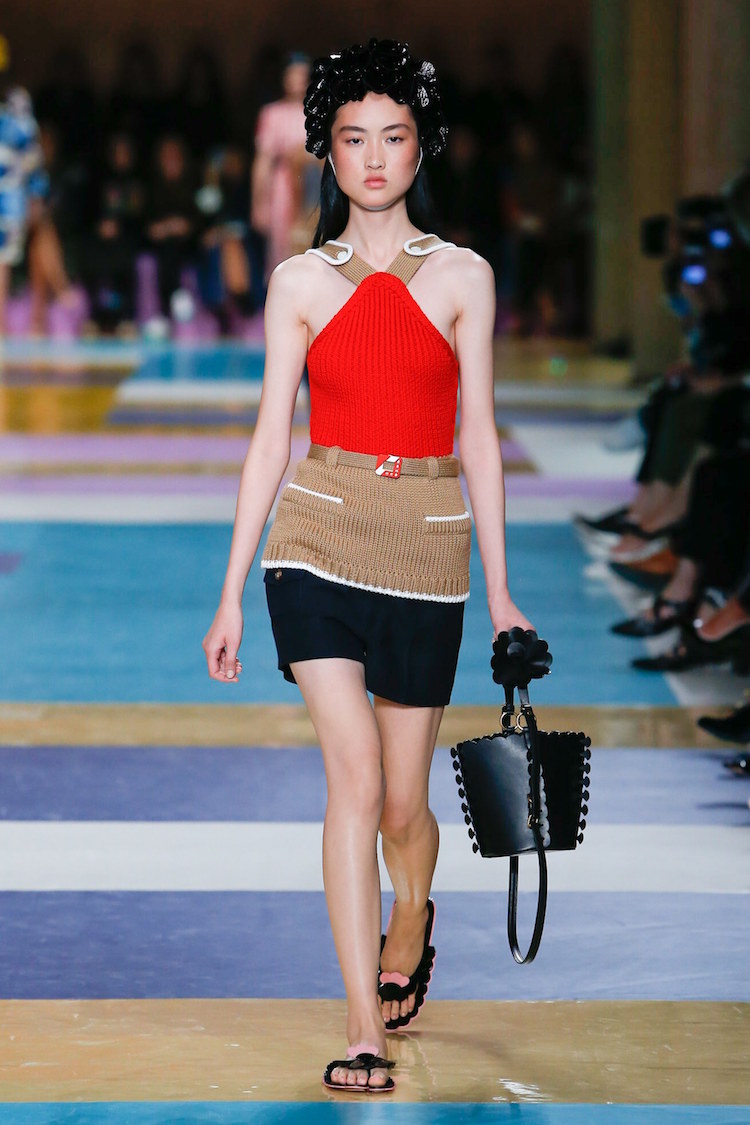 Miu Miu依旧保持了自己的少女情怀,即便是卡其色风衣外套,都需要一件肚兜式的短款棉质背心去以修饰。似乎只有这样,才能证明自己的品位出众。从整体上看,新季服装依旧秉承了Miu Miu古灵精怪一面的欢快节奏和配色组合,比如那几条带有1960年代风格的印花连衣裙,以及漆皮风衣外套搭配几何图案的泳衣的造型。这一季,Miu Miu鞋履的重点款式则是艳丽的纯色厚底鞋和俏皮的粉色人字拖。不可否认,Miu Miu的鞋履总是可以得到特殊的青睐,这点在集团财报中Miu Miu鞋履系列的销售额上也得到了证明。