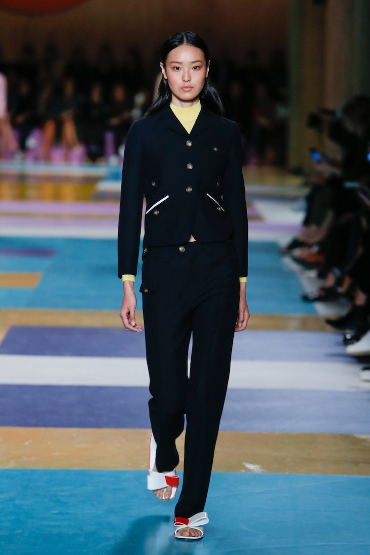 有关Prada和Miu Miu之间的微妙关系,两者有时候像是母女,优势则像是姐妹。比如这一季秀场上的竖条纹裤套装和风衣外套就像是把“Prada少妇”2016春夏系列里的某些款式偷偷地修改了一下,好让“Miu Miu少女”能够传承下去。这种通过面料或是款式上的趣味性联想总是可以在前一季的Prada与下一季的Miu Miu之间窥探到些许蛛丝马迹。或许这就是Miuccia Prada自己的小心思。