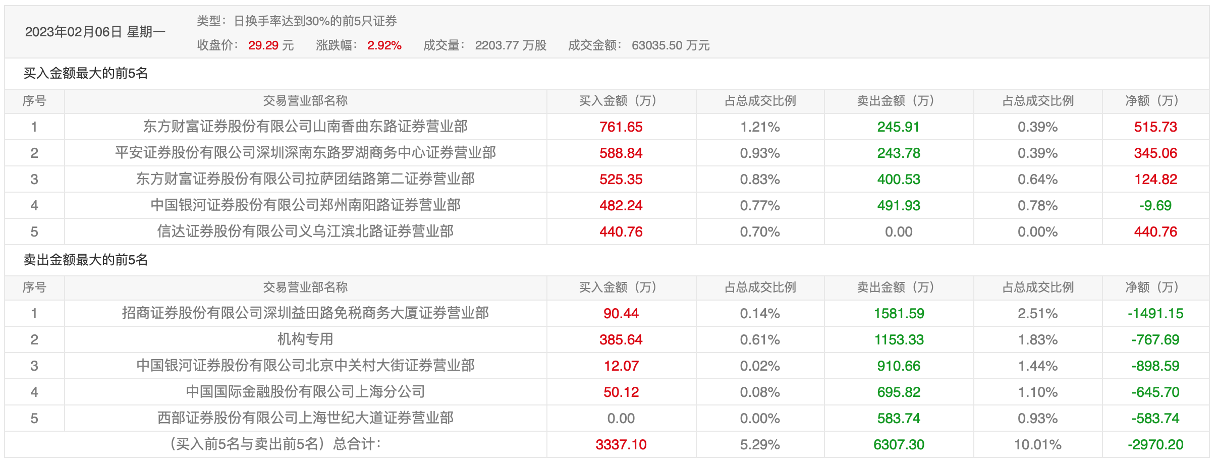 2月6日,慧博云通今日涨2.92%,龙虎榜数据显示,上榜营业部席位全天成交9644.39万元,占当日总成交金额比例为15.3%。其中,买入金额为3337.1万元,卖出金额为6307.3万元,合计净卖出2970.2万元。具体来看,机构买入385.64万元,卖出1153.33万元,合计净卖出767.69万元。此外,东方财富证券山南香曲东路证券营业部、平安证券深圳深南东路罗湖商务中心证券营业部分别买入761.65万元、588.84万元;招商证券深圳益田路免税商务大厦证券营业部、中国银河证券北京中关村大街证券营业部分别卖出1581.59万元、910.66万元。