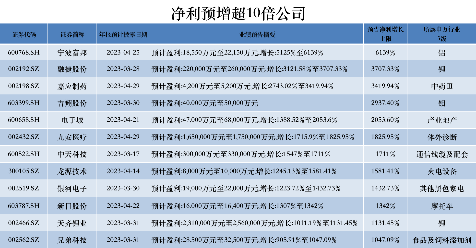 从业绩增幅看,有366家公司年报业绩预计翻倍,其中,12家公司预计2022年净利润增速超10倍。