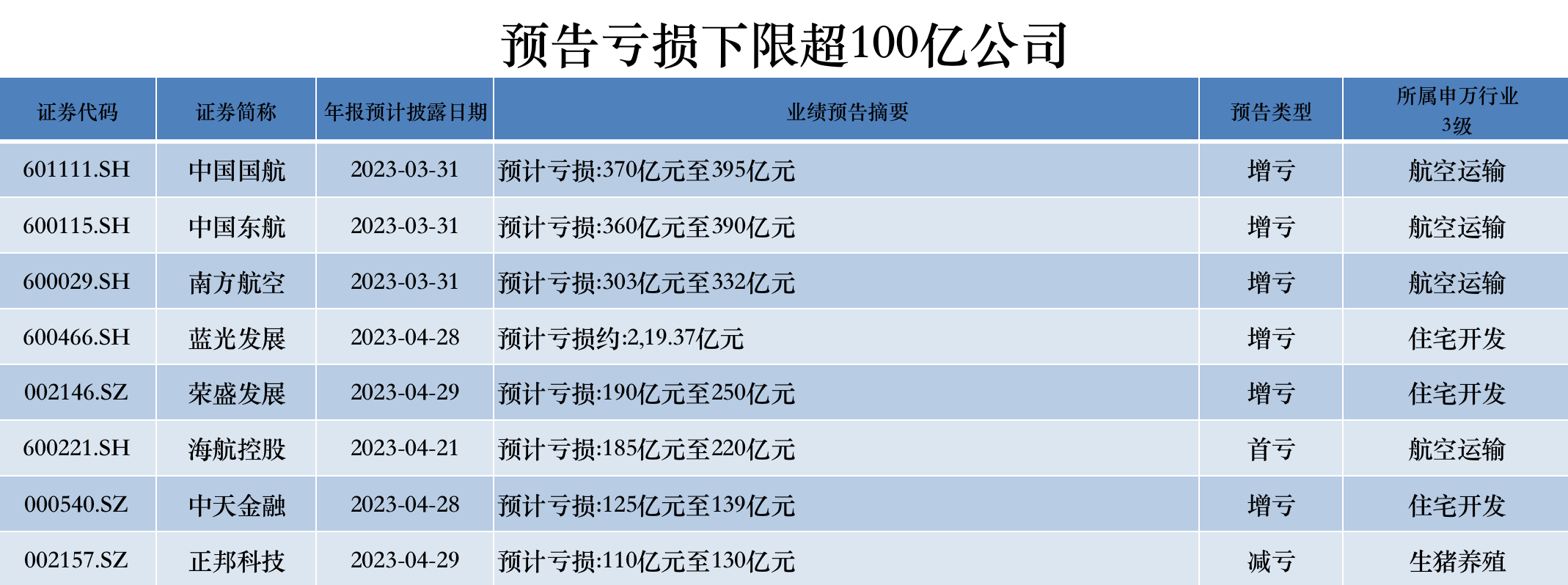 从预告净利润亏损下限来看,约110家公司预计2022年亏损过10亿元,其中有8家亏损超100亿元,分别为中国国航(601111.SH)、中国东航(600115.SH)、南方航空(600029.SH)、蓝光发展(600466.SH)、荣盛发展(002146.SZ)、海航控股(600221.SH)、中天金融(000540.SZ)、正邦科技(002157.SZ)。