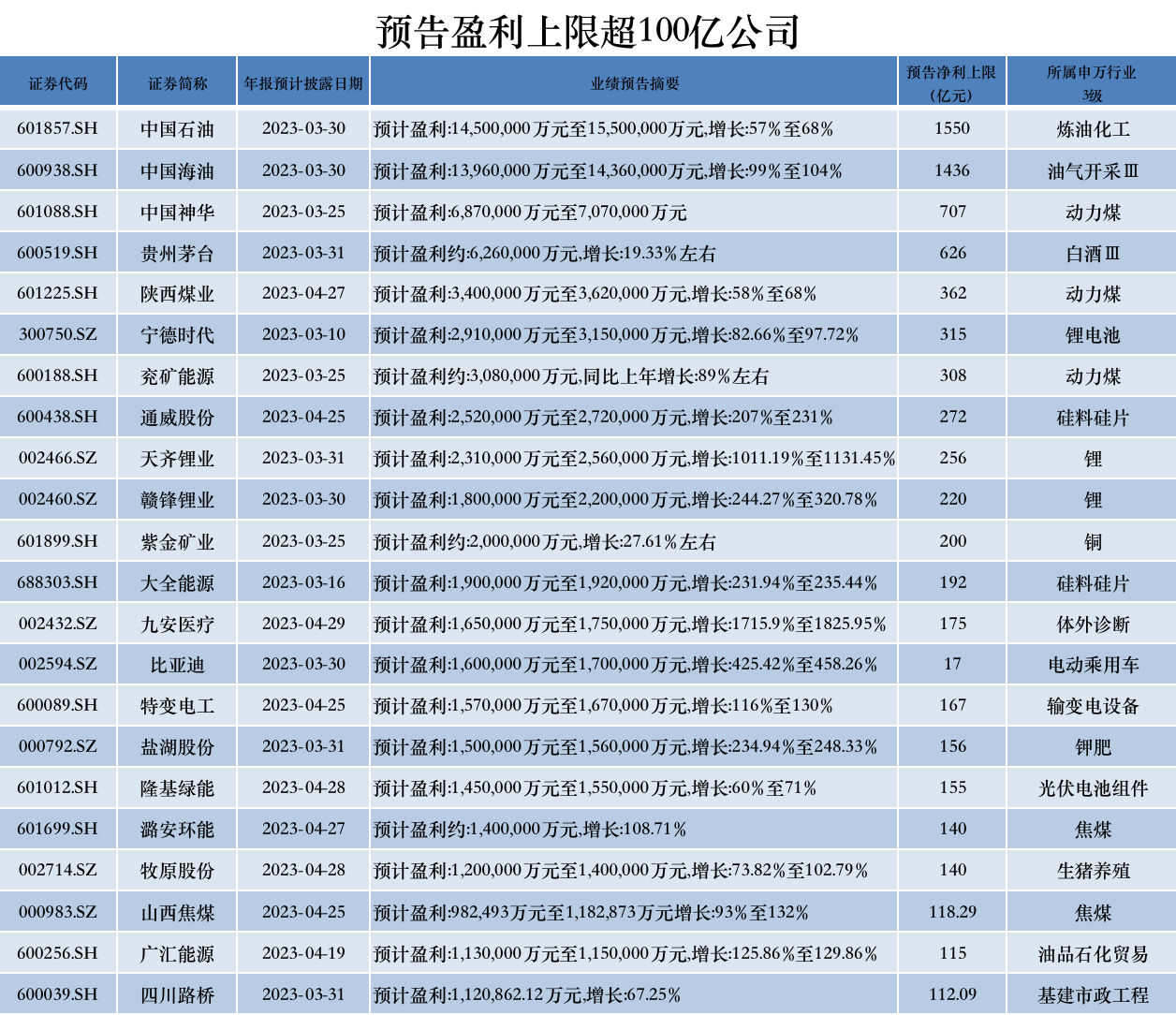 从预告净利上限来看,22家公司预告净利润上限超100亿元。这些A股最赚钱公司主要分布在煤炭、石油石化、有色金属、锂电池、光伏设备等行业。