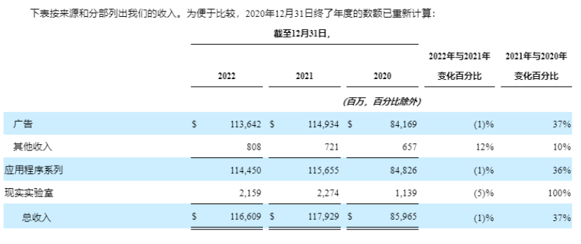 对此,Meta在财报中坦陈,2022年公司几乎所有的收入都来自广告业务。与2021年相比,公司广告收入受到了2022年广告需求减少的影响,一方面是由于宏观经济环境更具挑战性导致营销人员支出减少,另一方面则是由于iOS和监管环境的变化导致我们的广告定位和衡量工具受到限制,最终导致每个广告的平均价格下降了16%。