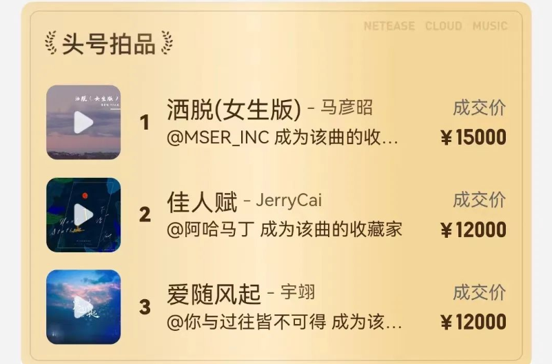 如今过去两个多月,“音乐收藏家”已经产生了不少拍卖。从交易排行来看,目前成交价格在100元到1.5万元间不等,成交价超过5千的有12首,其中过1万元的有5首,类型涵盖嘻哈、流行、民谣、纯音乐等。
