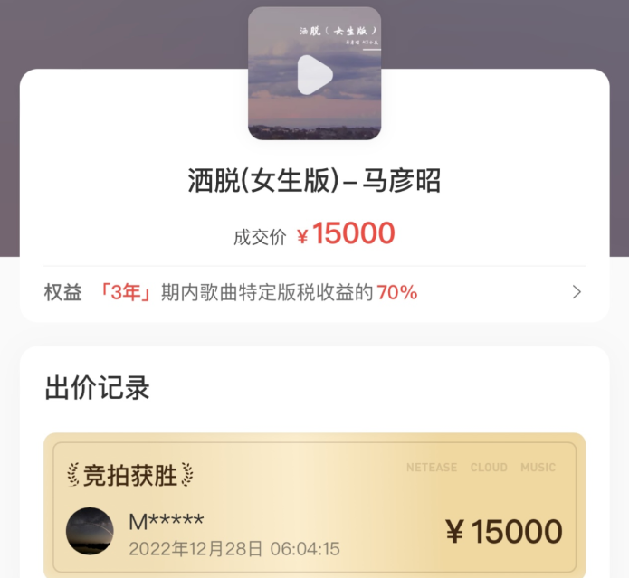 目前来看,这个新功能对于音乐人而言似乎是百利无害,可以自行设定符合心理预期的价格,出让几年的版税分成就快速换到一笔收入,还能保留版权。并且如果拍出了高价,或也能成为歌曲的卖点之一,像马彦昭一样在不同社交平台进行宣传,进一步增加歌曲和音乐人的曝光度。