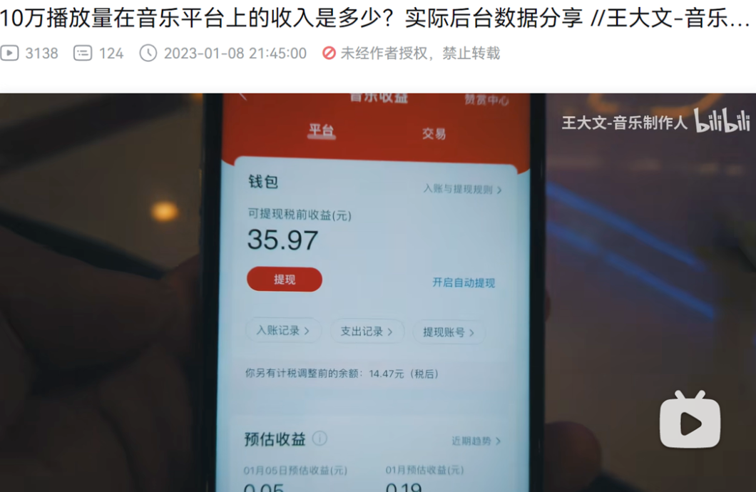 据B站Up主“王大文——音乐制作人”在2023年1月发布的视频中介绍,达到10万播放量的可提现税前收益在网易云音乐为35.97元。也就是说,每千次播放的收益约为0.3597元。