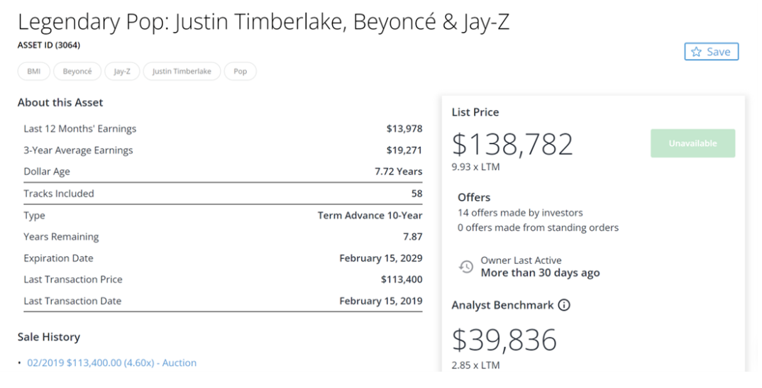 比如Royalty Exchange,该平台支持音乐人或版权拥有者通过发起竞拍、出价转让歌曲或曲库的部分或全部版税。在购买前,平台会向投资者提供歌曲在过去一年的收益情况等信息,帮助投资者做决定。