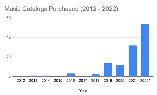 据MBW统计,2021年的60多笔全球音乐行业大型交易中,至少有50亿美元是用于曲库和音乐版权收购,下场的资本不乏KKR、Black Rock这样的投资巨头。2022年,虽然热潮有所减退,但David Bowie、Sting、Neil Diamond的曲库也都卖出了九位数,成为资本们抵抗风险的另类资产。