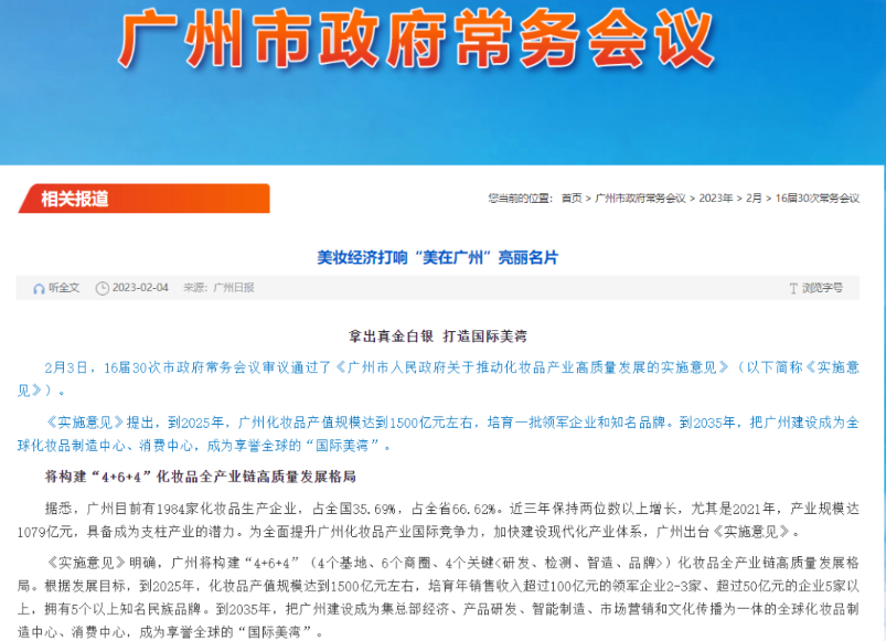 为实现这两大目标,广州计划构建“4+6+4”(4个基地、6个商圈、4个关键<研发、检测、智造、品牌>)化妆品全产业链高质量发展格局。