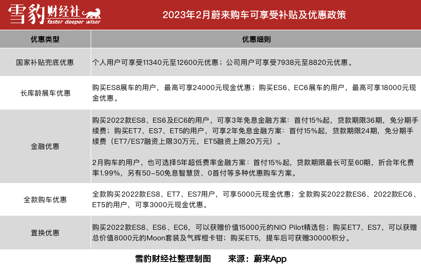 次日,蔚来官方认证账号“购车百晓生”在蔚来App上发帖,整理了2023年2月购车可享受的补贴及优惠政策。