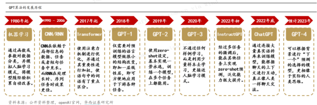 在算法模式版本上,ChatGPT已经历了四次迭代,包括GPT-1、GPT-2、GPT-3,以及最新的ChatGPT,未来有望生成GPT-4新版本。