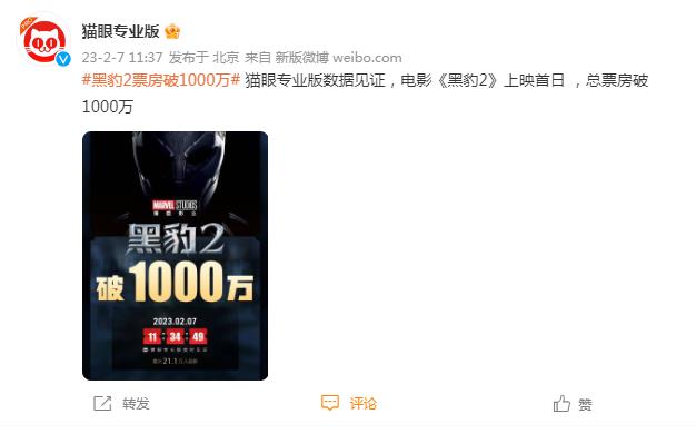 据@猫眼专业版,截至2月7日11:34:49,电影《黑豹2》上映首日,总票房破1000万。