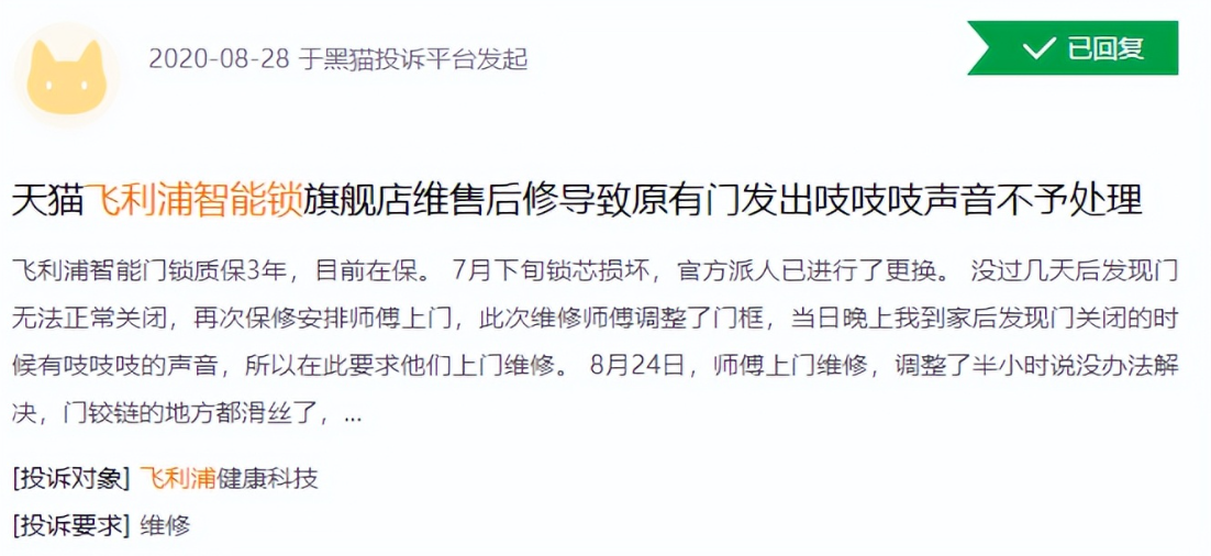 黑猫投诉平台上,就有消费者发帖称,“飞利浦智能锁安装师傅操作不当损坏门框,客服态度差,售后电话不通,官方售后和天猫旗舰店售后无人解决问题。”亦不乏众多消费者投诉平台或官方旗舰店反映“门锁锁不上”“门锁打不开”“门锁无指令自动开门”等产品缺陷问题。